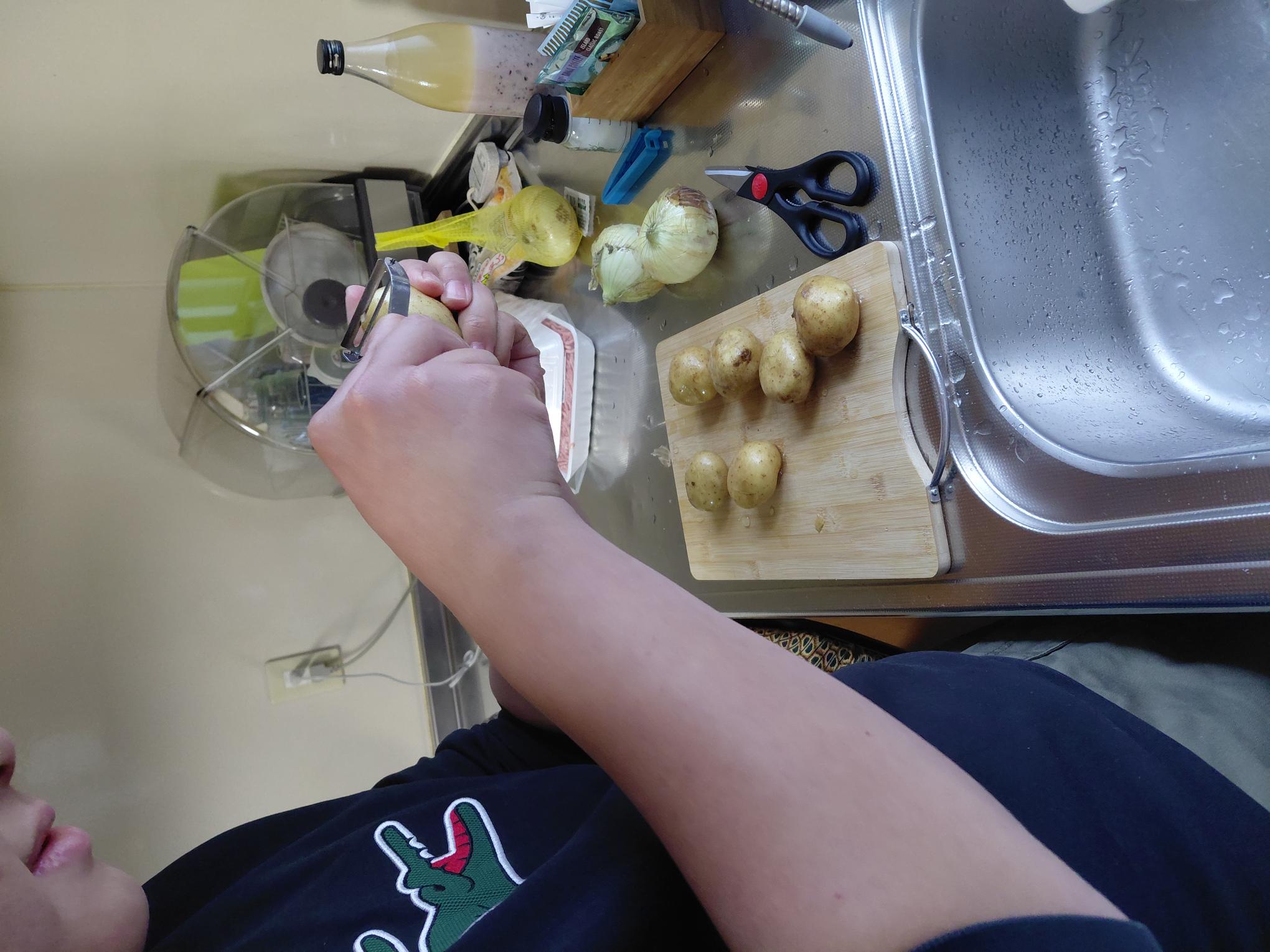ジャガイモの皮むき・玉ねぎのみじん切り・味付けも何が多めが美味しいなど聞きながら、